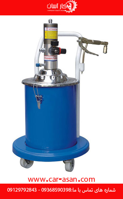 این مدل با یک مخزن سطلی عرضه میشود که ظرفیت مناسبی برای نگهداری گریس دارد. مخزن با درپوش فلزی مقاوم، در برابر فشار و ضربه دوام بالایی دارد. همچنین، وجود گان گریسزن بادی باعث سهولت در استفاده شده و کنترل دقیقی روی مقدار تزریق گریس فراهم میکند. این گان به یک لوله مقاوم و منعطف متصل است که امکان دسترسی به نقاط سخت خودرو را میسر میسازد. چرخهای زیر دستگاه نیز جابهجایی آن را بسیار آسان کردهاند، بهویژه در محیطهای کاری شلوغ مانند تعمیرگاهها.